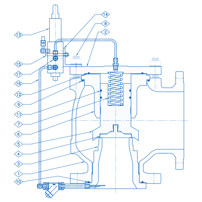 Pio-Safe , BTS-5000 Series , is a self-actuating , Angle discharge , Non-Flowing Snap [ Pop ] type / Modulating type Pilot operated , Semi-Full Nozzle Integrally Cast , Flanged end Pressure Relief Valve